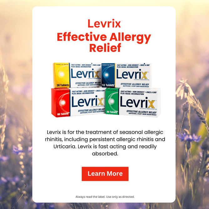 Another advantage of Levrix is its once-daily dosing, making it convenient for busy lifestyles. Simply take one tablet each morning, and you're set for the day ahead. No need to worry about multiple doses or complicated dosing schedules – Levrix simplifies allergy relief so you can focus on what matters most.
